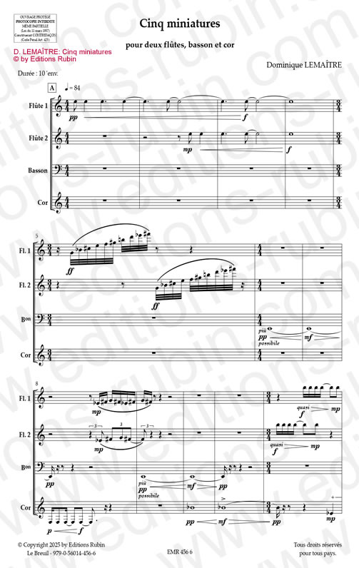 pour flûte, saxophone ténor, trompette, trombone, percussion, violon et violoncelle |